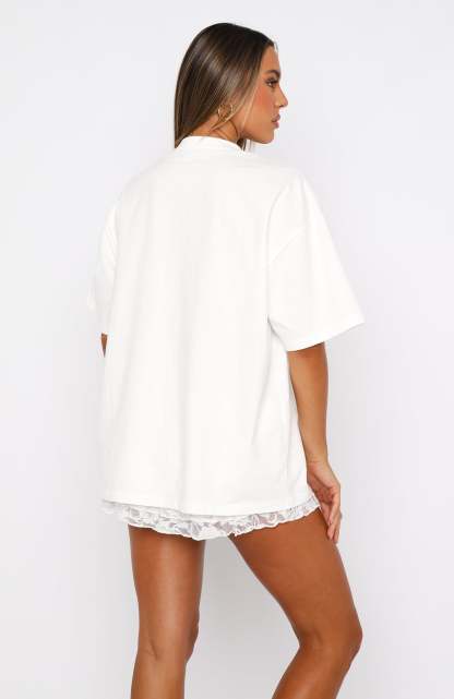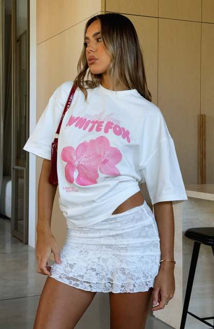 The With Love Forever Oversized Tee White/Pink is an easy, wear-everywhere tee! It is an oversized fit with slouch shoulders, round neckline, and a printed logo side front and centre back. We love this paired our With Love Lace Mini Skirt!